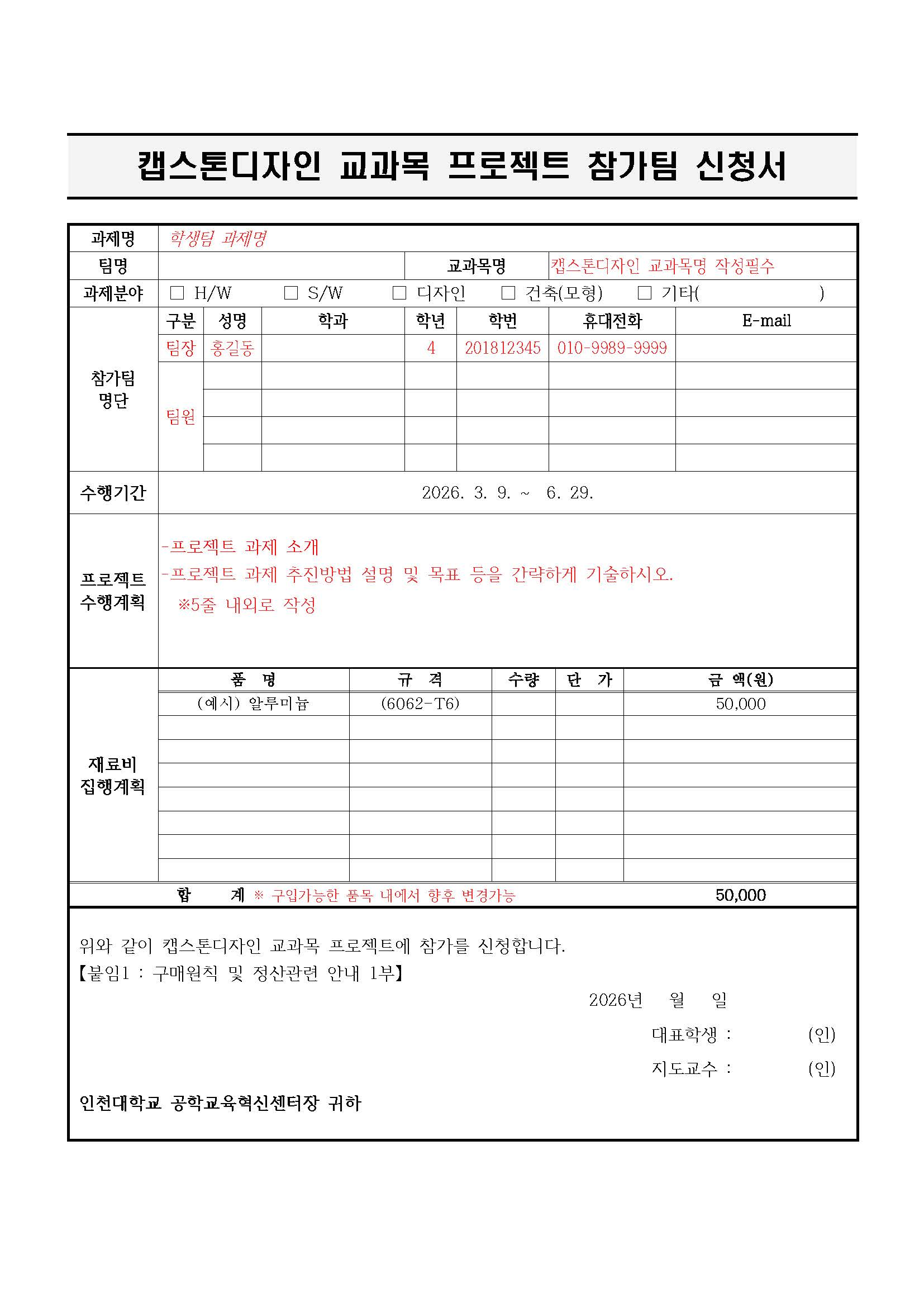 붙임 1. 캡스톤 디자인 참가 신청서(팀별 작성) 1부. (필요한 학생은 위의 메일로 요청 바랍니다.)
